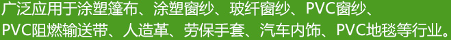 廣泛應(yīng)用于涂塑篷布、涂塑窗紗、玻纖窗紗、PVC窗紗、PVC阻燃輸送帶、人造革、勞保手套、汽車(chē)內(nèi)飾、pvc地毯等行業(yè)。